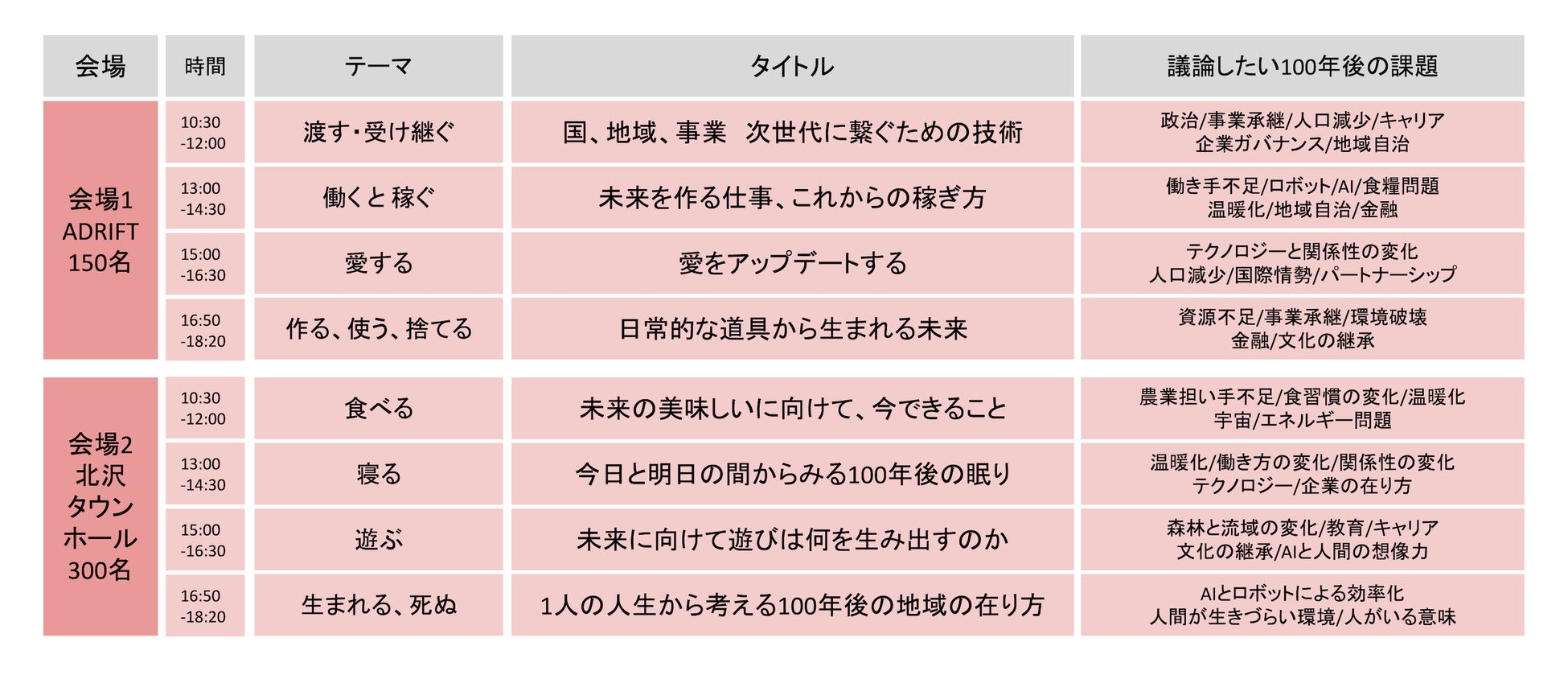 続くメインセッションでは、100年後の未来の課題を、今現在生きる私達ができることに繋げるために、『動詞』を基軸にを2会場、合計8つの対談をご用意。