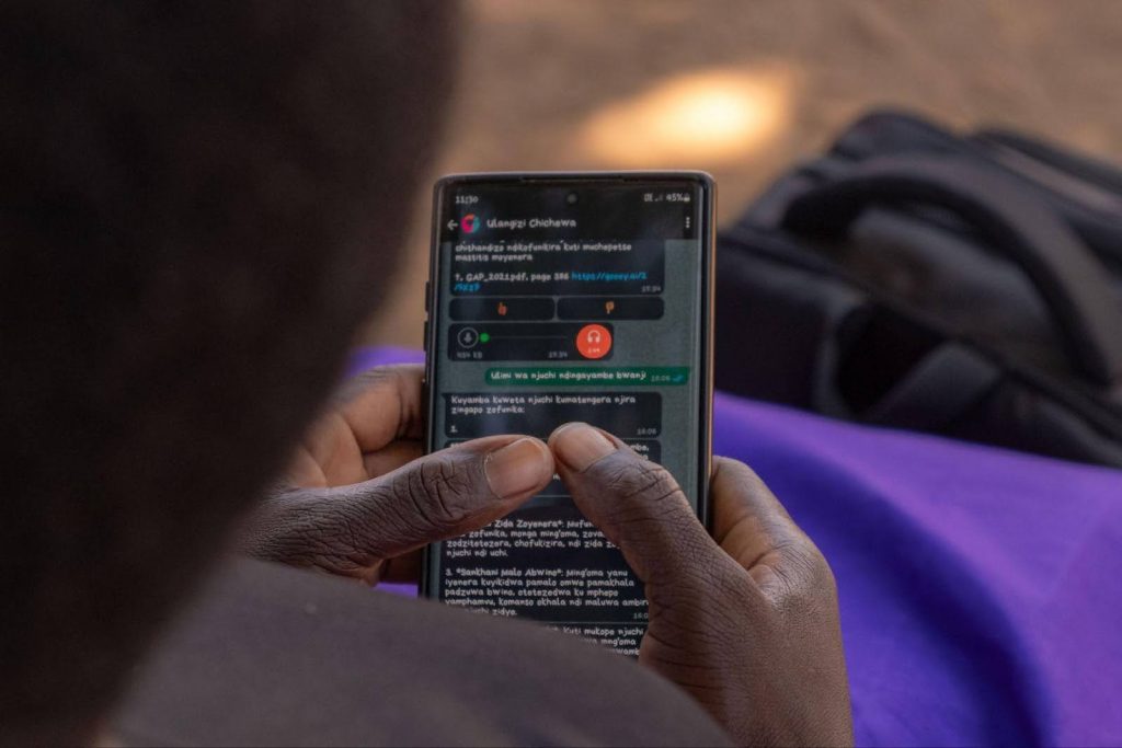 2024年、同団体はマラウイで「Ulangizi」というチャットボットをパイロット展開しました。特徴的なのは、現地語であるチチェワ語と英語の双方に対応し、テキストだけでなく音声や写真入力も可能にした点です。これにより、読み書きのリテラシーやネット接続環境に制約がある農村地域でも活用できる仕組みを実現しました。農家は作物の病気や害虫に関する写真を送信し、チャットボットから具体的な対応策を得ることができます。教師にとっては授業計画や教材作成を支援するツールとしても役立っています。